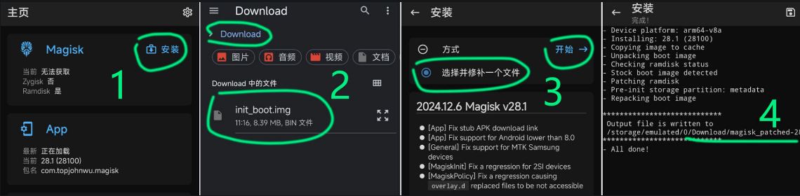 请查看刷机包提取带有boot.img(出厂安卓12以下),init_boot.img(出厂安卓13以上)启动内核的img镜像。打开Magisk →→→ 点击带有面具logo右边的“安装” →→→ “选择并修补一个文件” →→→ 选择要修补的img的镜像文件 →→→ 等待Magisk修补完成。修补生成的文件 magisk_patched-xxx.img 在 Download 目录里。- 手机插电脑,打开 传输文件 模式,打开 Download 目录,把 magisk_patched-xxx.img 复制到电脑桌面上。