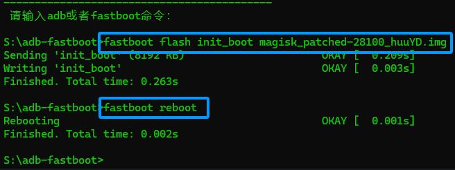 fastboot flash init_boot <面具文件> 或者 fastboot flash boot <面具文件>之后按下回车等待显示"OKEY"字样代表刷入成功了fastboot reboot 输入重启手机命令