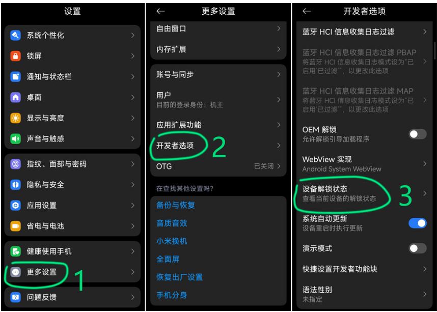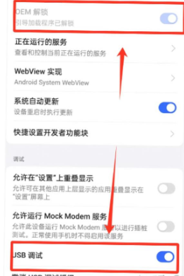 “开发者模式”里找到“OEM解锁”和USB调试并打开。 -