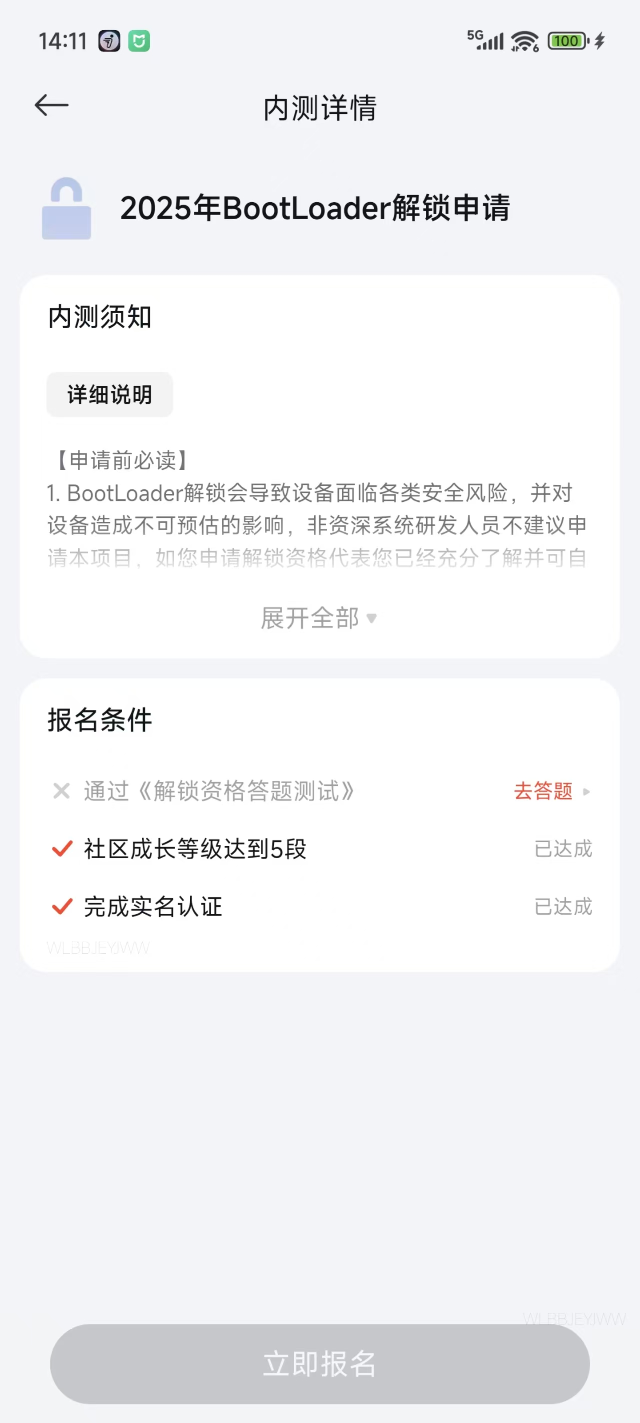 Xiaomi HyperOS系统用户,请在"小米社区"内测模板中的“Bootloader解锁申请”中答题。